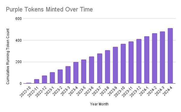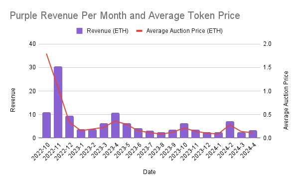 Since inception, the Purple daily auction price has averaged 0.318 ETH per token. If we exclude the first two outlier months, the daily average auction price is 0.186 ETH.