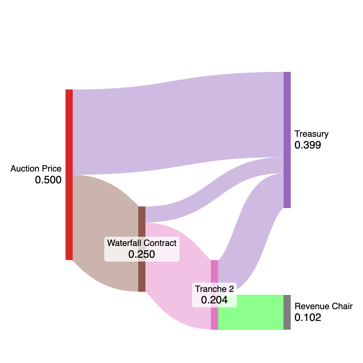 A: The Revenue Chair receives payment if the auction closes above the 90-day trailing average price. In practice, the Treasury receives 50% of any auction price, plus a flat ~.047 ETH to prevent downside risk. The Treasury and Revenue Chair then split the remaining upside 50/50. This is achieved with a split contract.