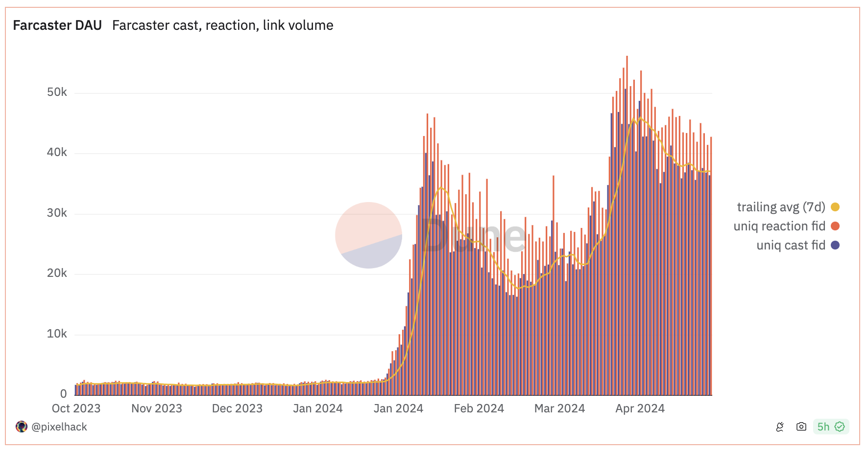 In the same time period, Farcaster has added several hundred thousand DAU as measured by paid accounts with at least one cast, reaction, or link.