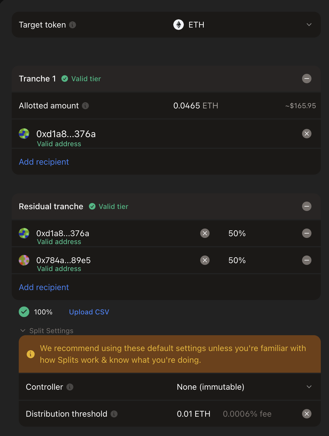 The Treasury receives a flat ~0.047 ETH as part of Tranche 1 to prevent downside risk