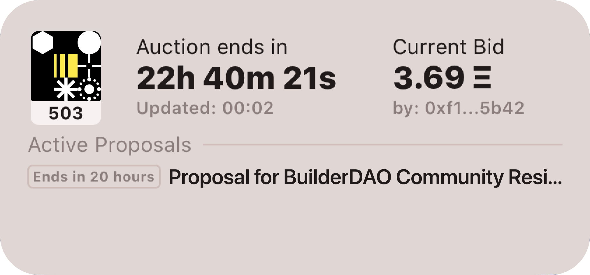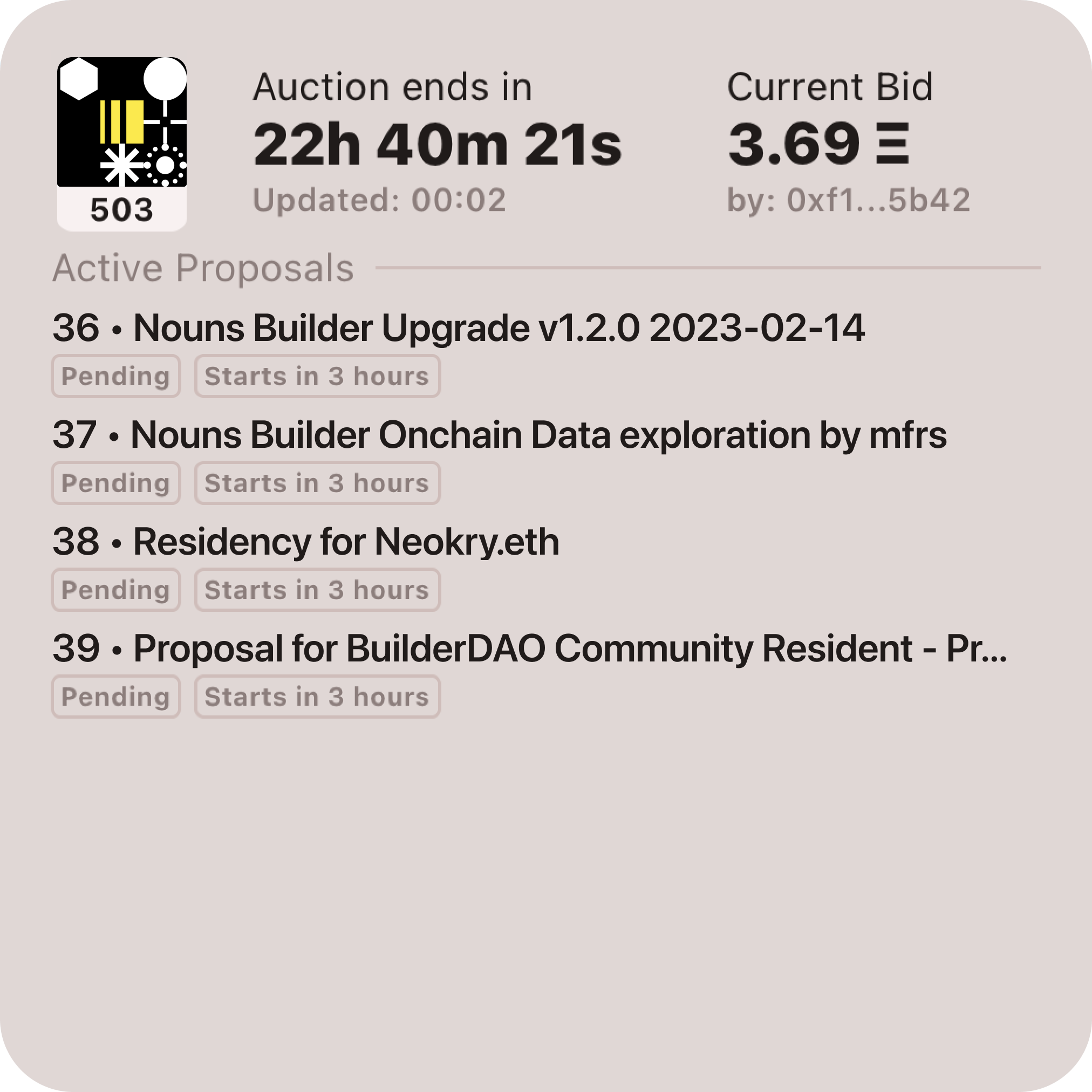 We propose expanding the successful Nouns Widgets to all DAOs created using the Builder tool. These widgets provide critical auction and governance data in a compact format, accessible right from users’ home screens. The expansion will offer various widget types, tailored for each DAO, and customizable notifications. Developed by NG, who has experience in the Nouns ecosystem, the project requires 15 ETH in funding to cover development, support, and infrastructure costs for one year.