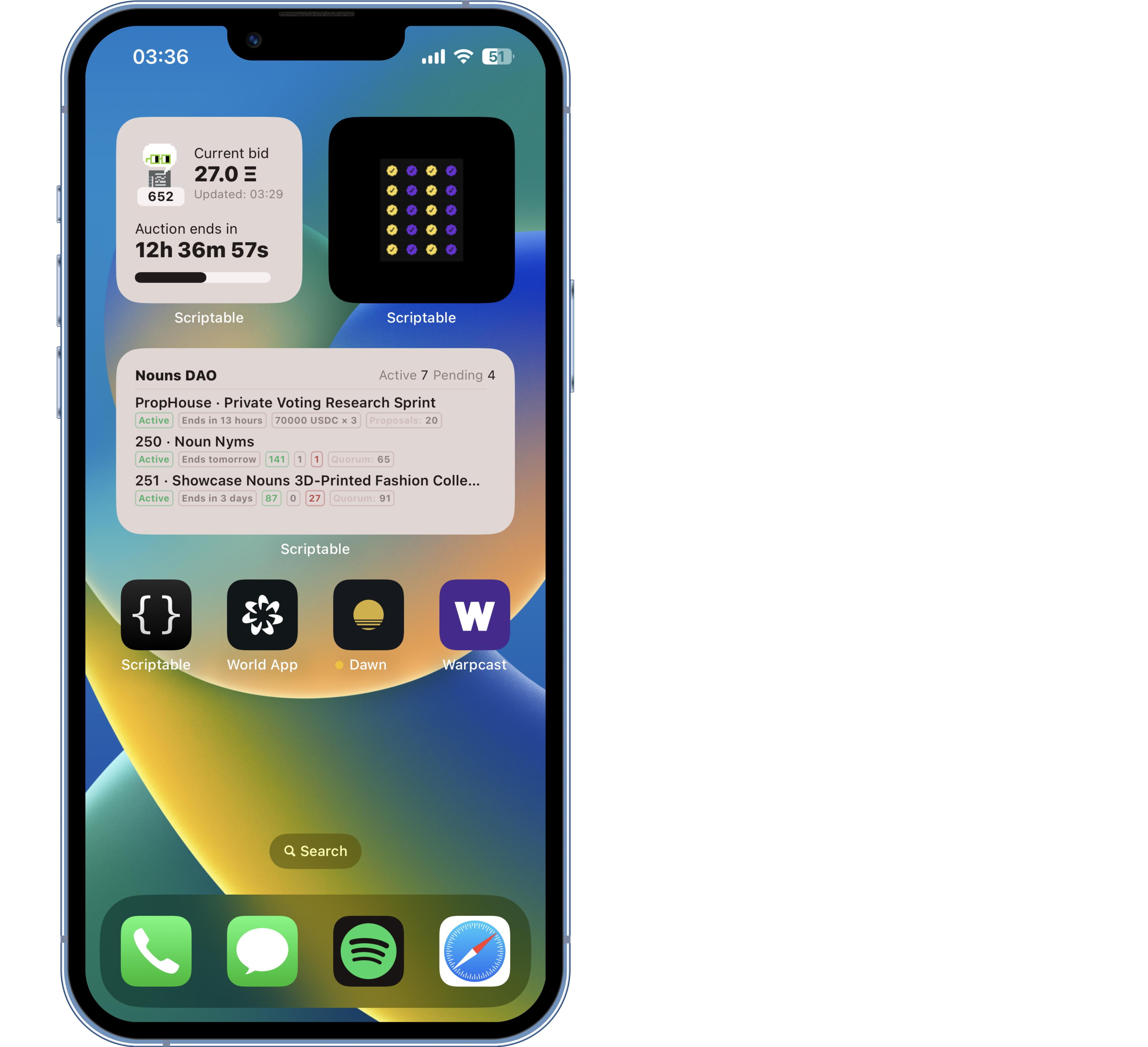 Nouns Widgets have seen a success within NounsDAO, with many members using it to track proposals and auctions. They present the most critical data in a compact and easy-to-digest format helping holders always stay on track with the DAO. With them, you don’t need to open websites/applications to see the progress of auctions and proposals, as you can easily see this information right from your home screen.