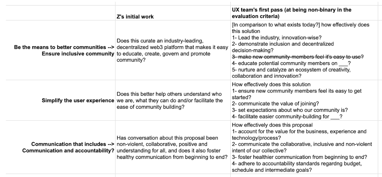 For example, it currently defines our core values using an either/or, yes/no, binary approach (either this prop does or doesn’t align with this core value), then suggests that a non-binary scale of 1-5 be used for that evaluation. It would be better served to more specifically define those levels for each core value, as seen in the working document image below: